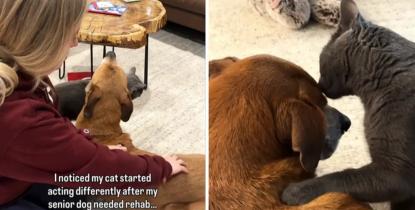 Кіт після хвороби собаки несподівано почав виявляти увагу до тварини, демонструючи дивну поведінку у той час, коли власниця займалася реабілітацією улюбленця. Ембер Акварт масажувала собаці Оклі поранене місце, аж раптом зауважила нетипову увагу кота Р...
