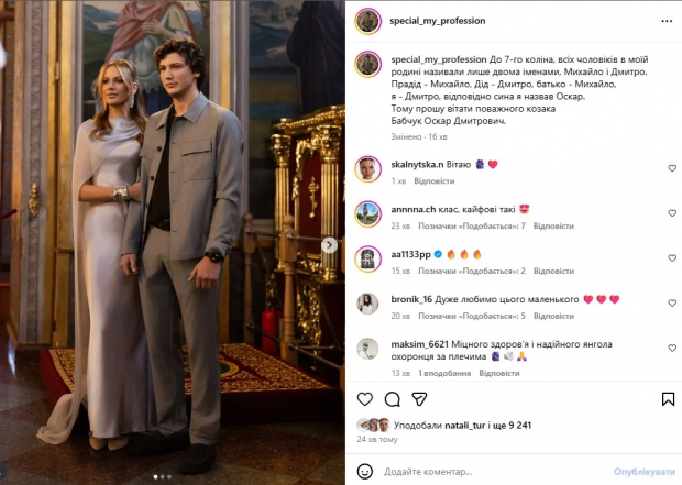 Воїн ЗСУ Дмитро Бабчук розповів, яке ім'я вони з Нікітюк обрали для сина. «До 7-го коліна, всіх чоловіків у моїй родині називали тільки двома іменами, Михайло і Дмитро. Прадід — Михайло, дід — Дмитро, батько — Михайло, я — Дмитро, відповідно сина я назвав Оскар. Тому прошу вітати поважного козака — Бабчук Оскар Дмитрович», — повідомив захисник.