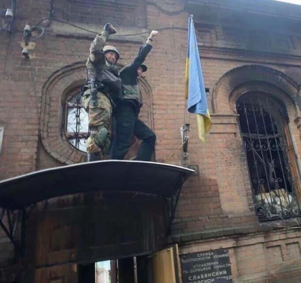 "На фото: ми з Романом у Словʼянську в липні 2014 року, на другий день після його звільнення від рашистів. Встановлюємо наш Прапор на будівлі місцевого СБУ, яке рашисти перетворили на катівню", — йдеться в дописі військового.