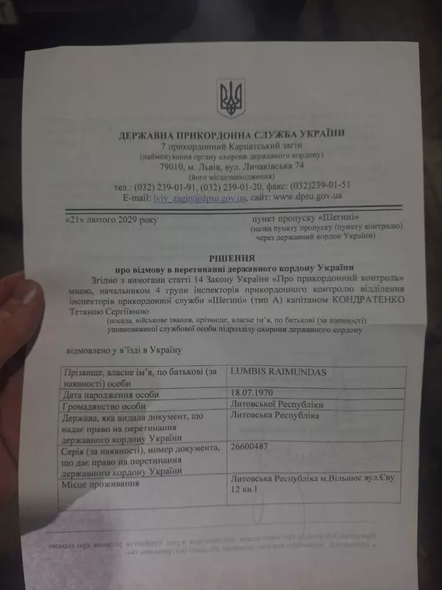 Однак, за словами "Штірліца", на пункті пропуску, який обслуговує 7-й прикордонний Карпатський загін, інспекторка митної служби Тетяна Кондратенко, на підставі рішення Державної міграційної служби України, заборонила Раймондасу Лумбісу в’їзд в Україну строком на три роки. Причиною стала несплата штрафу за порушення правил дорожнього руху у розмірі 680 грн.