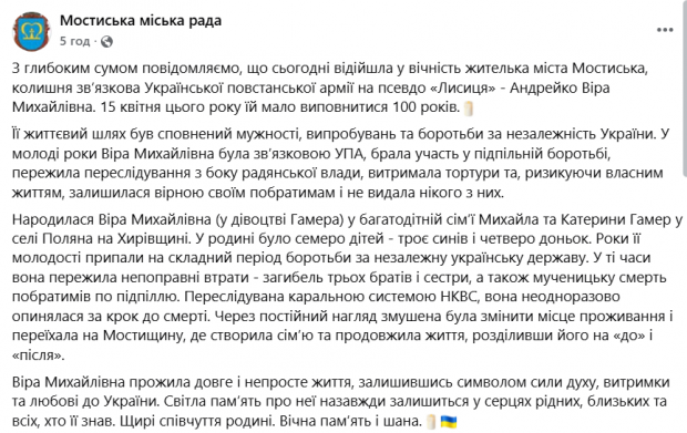 «Роки її молодості припали на складний період боротьби за незалежну українську державу. У ті часи вона пережила непоправні втрати – загибель трьох братів і сестри, а також мученицьку смерть побратимів по підпіллю. Переслідувана каральною системою НКВС, вона неодноразово опинялася за крок до смерті. Через постійний нагляд змушена була змінити місце проживання і переїхала на Мостищину, де створила сім’ю та продовжила життя, розділивши його на «до» і «після». Віра Михайлівна прожила довге і непросте життя, залишившись символом сили духу, витримки та любові до України», – йдеться у заяві.