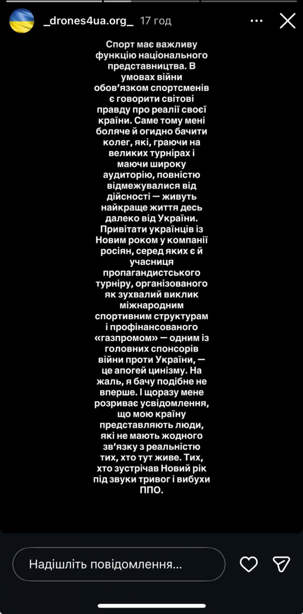 Привітати українців із Новим роком у компанії росіян, серед яких є й учасниця пропагандистського турніру, організованого як зухвалий виклик міжнародним спортивним структурам і профінансованого «газпромом» — одним із головних спонсорів війни проти України, — це апогей цинізму. На жаль, я бачу подібне не вперше.