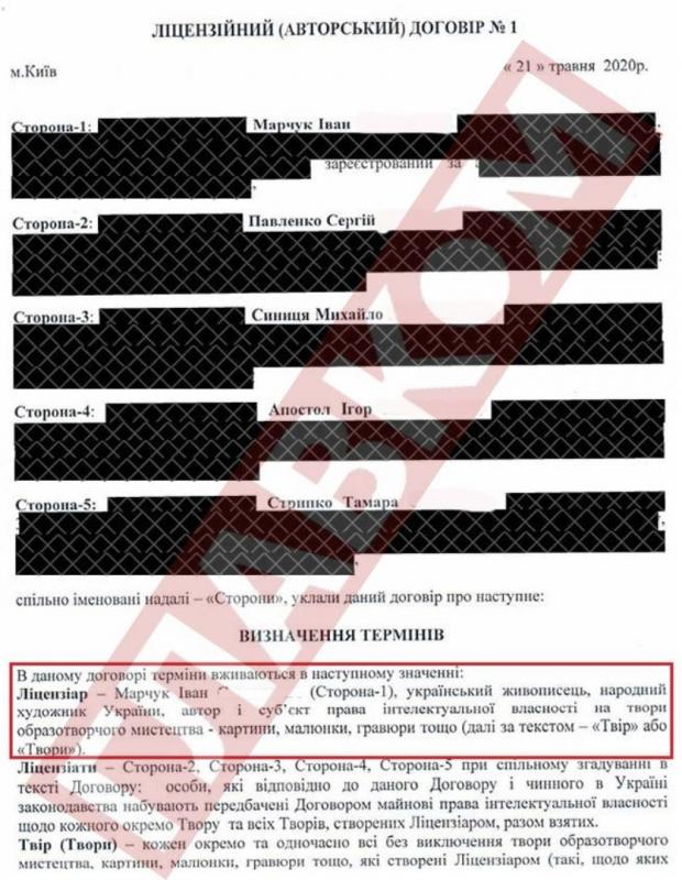 Врешті Апостол запропонував всім поїхати до майстерні художника на вулицю Євгена Чикаленка у Києві. А вже там Апостол сказав, що він має їхати у справах. Михайло Синиця та Тамара Стрипко піднялися до майстерні художника без політика. Коли ж вони переступили поріг, Іван Марчук, не читаючи документ, поставив свій підпис під ним. У розпорядженні ЗМІ опинилася копія цього документа. Йдеться про ліцензійний (авторський) договір із підписами п’яти людей: Івана Марчука, Сергія Павленка, Михайла Синиці, Ігоря Апостола (син екснардепа) та Тамари Стрипко.