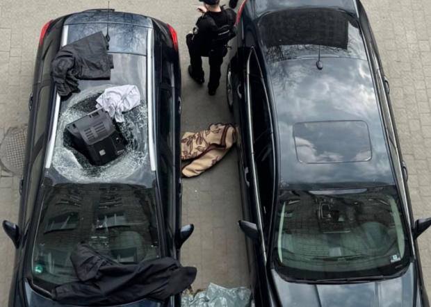 Телевізор впав на дах автомобіля, припаркованого поруч з будинком, пошкодивши його. На правопорушника складено адміністративний протокол, в подальшому суд призначить йому покарання.
