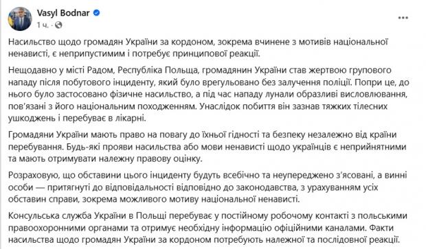 "Громадяни України мають право на повагу до їхньої гідності та безпеки незалежно від країни перебування. Будь-які прояви насильства або мови ненависті щодо українців є неприйнятними та мають отримувати належну правову оцінку. Розраховую, що обставини цього інциденту будуть всебічно та неупереджено з'ясовані, а винні особи притягнуті до відповідальності відповідно до законодавства, з урахуванням усіх обставин справи, зокрема можливого мотиву національної ненависті", — наголосив він.