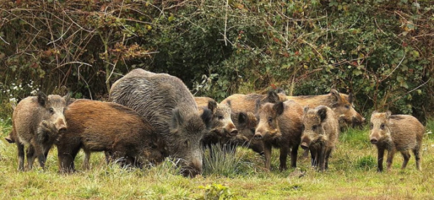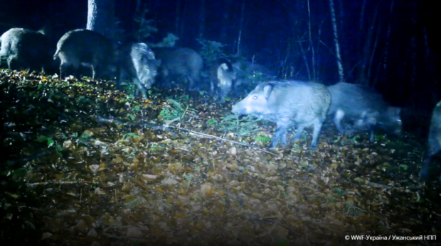 Фотопастки також зафіксували групу кабанів, що рухається разом. Це типовий формат для виду — череда забезпечує захист і полегшує пошук їжі.