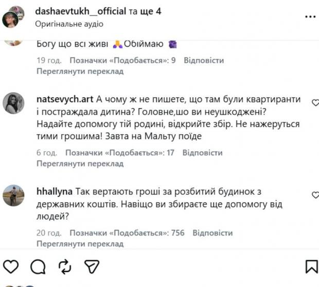 Крім того, пару звинуватили в тому, що вони давно не живуть у цьому будинку і приховують інформацію про сім'ю, яка орендує у них це житло. "Ви там не живете, а ось хто дійсно залишився без даху над головою, так це ваші квартиранти, сім'я з дітьми. І ні слова про сім'ю, яка орендувала це житло і постраждала", - зазначили в коментарях.