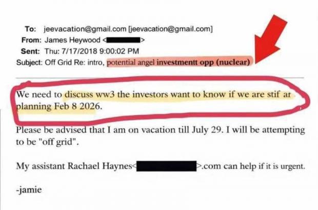 У так званих файлах Джеффрі Епштейна, які продовжують з’являтися у відкритому доступі, виявили згадки про те, що певні інвестори нібито планували обговорення сценарію початку Третьої світової війни 8 лютого 2026 року, передають Патріоти України.