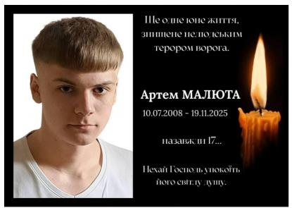Внаслідок ракетного удару РФ по Тернополю загинув 17-річний студент Артем Малюта. Його мрії та плани на майбутнє обірвала безжальна війна. Трагедія сталася 19 листопада. Про це повідомили у ВСП "Тернопільський фаховий коледж ТНТУ ім. І. Пулюя", де навч...