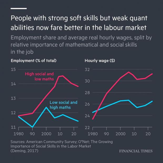 Аналітики з’ясували, що фахівці з добре розвиненими комунікаційними навичками, навіть за слабших знань у точних науках, мають вищий рівень зайнятості та отримують більші зарплати. Натомість люди з відмінною математикою, але поганими навичками спілкування, частіше стикаються з проблемами працевлаштування і повільнішим кар’єрним зростанням.