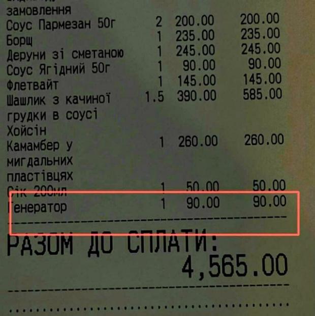 Уявіть: ви сідаєте за столик, замовляєте деруни зі сметаною, шашлик з качиної грудки чи камамбер у мигдальних пластівцях… і раптом бачите у своєму чеку рядок «Витрати на генератор — 90 грн». Саме такий несподіваний «бонус» зафіксував відвідувач одного з київських ресторанів, передають Патріоти України з посиланням на "Великий Київ".