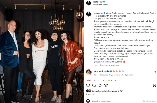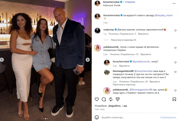 Українська блогерка і фітнес-тренерка Ілона Чернобай, у якої один мільйон підписників в Instagram, гнівно звернулася до хейтерів, які засудили її через фото і відео з Настею Каменських і Потапом. Чорнобай, яка проживає зараз у США, зустрілася з Потапом і Каменських у Маямі. Олексій Потапенко відкрив у Маямі свій бар. На відкритті побувала Чорнобай. В Instagram блогерка прорекламувала заклад Потапа, і нарвалася на хейт, передають Патріоти України.