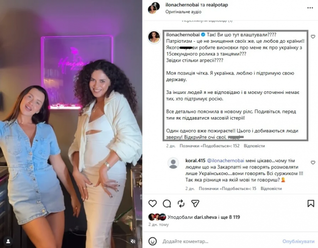 Чорнобай також записала відеозвернення. «Я просто в ужасі. Патріотизм — це не про ненависть до своїх, а про любов до країни та реальні вчинки! Я відповідаю за свої дії, а не за чужі очікування. Дякую всім, хто залишається зі мною, попри спроби нас розділити», — заявила вона.