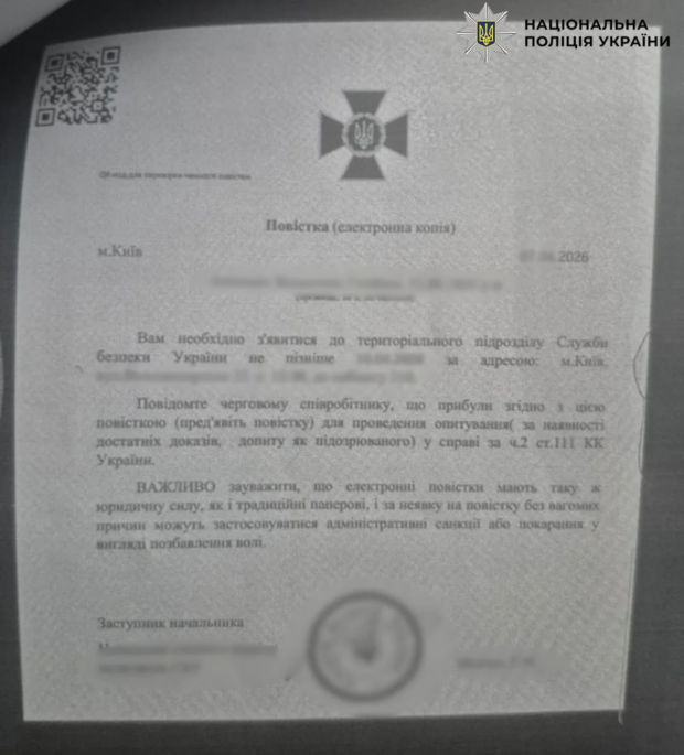 За даними слідства, з народною артисткою України телефоном зв’язався чоловік, який назвався працівником СБУ та почав залякувати жінку, безпідставно звинувачуючи її у державній зраді. Правоохоронці розповіли, щоб артистка повірила його словам, підозрюваний підробив повістку про необхідність з’явитися до спецслужби та надіслав жінці.