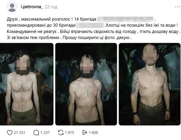 За її словами, солдати залишилися на позиціях без їжі та води, а командування не реагує на ситуацію. «Бійці втрачають свідомість від голоду, пʼють дощову воду. Зі звʼязком теж проблеми», — йдеться в повідомленні.