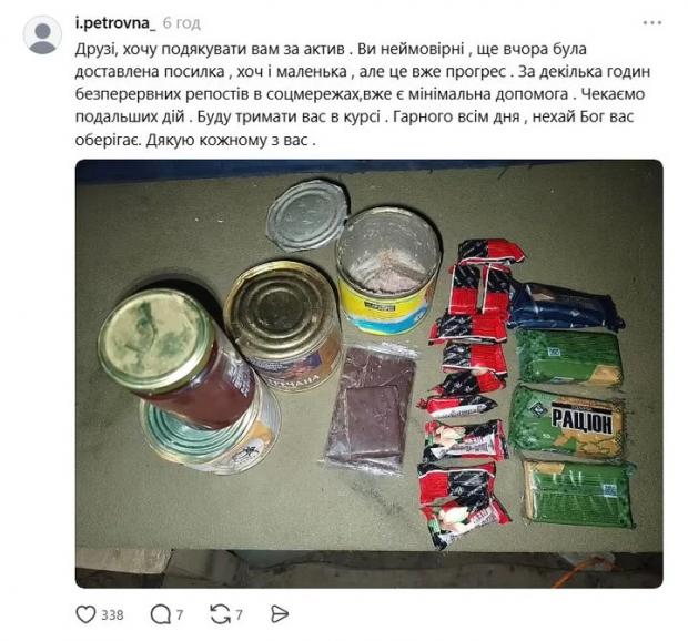 Вона також повідомила, що попри складну логістику, продовольство доставили для чотирьох військових. Це також підтвердила користувачка i.petrovna у соцмережі.
