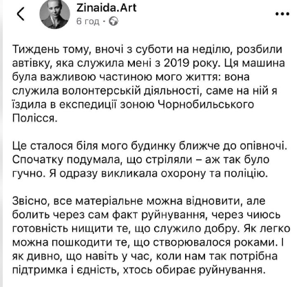 Зауважимо, пошкодження автівки Зінаїди Кубар за дивним збігом обставин співпало з розбірками з її колишнім. Художниця заявляє про переслідування та погрози з боку політика.