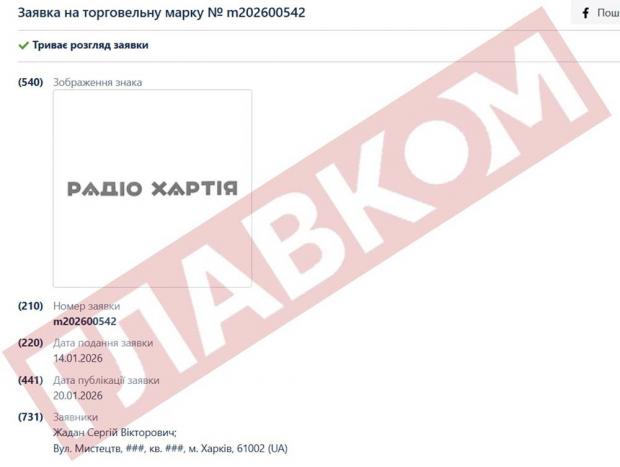 Сергій Жадан має намір закріпити за собою права на використання торговельної марки «Радіо Хартія». Заявку на реєстрацію марки (№m202600542) він подав ще у середині січня. Наразі триває розгляд поданих документів.