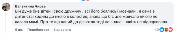 «Я не можу мовчати! Я хочу аби все місто знало, що Олександр Куліш — це п*дофіл, який вчиняв розпусні дії відносно десятків дівчат і всі вони досі мовчать! Він залякував кожну дівчину, тиснув на батьків і звинувачував кожну дитину в брехні, коли відчував, що про його вчинки діти можуть наскаржитись. І йому завжди це вдавалось. Батьки не вірили дітям масово! Я спілкувалась із багатьма вихованками — всі, хто наважувався розповісти батькам, ніхто не отримував підтримки, ніхто! Всім вже перед цим звонив Куліш і скаржився на дитину, звинувачував у поганому відношенні до занять, звинувачував у брехні!», — поділилася ще одна жінка.