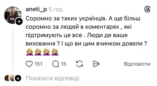 За 10 годин допис завірусився й отримав понад 200 тисяч переглядів. Понад 21 тисячі користувачів поставила «лайк» на історію, ще понад 800 осіб поширило. У коментарях думки українців розділились — частина користувачів написала, що це не культурно, невиховано й показує українців не з кращої сторони.