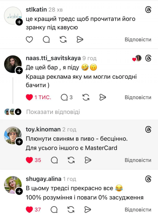 Проте більшість людей все ж були у захваті. «Це кращий тредс, щоб прочитати його зранку під кавусю», «краща реклама, яку ми могли сьогодні бачити», «це безцінно», «100% розуміння, 0% засудження», — пишуть українці.