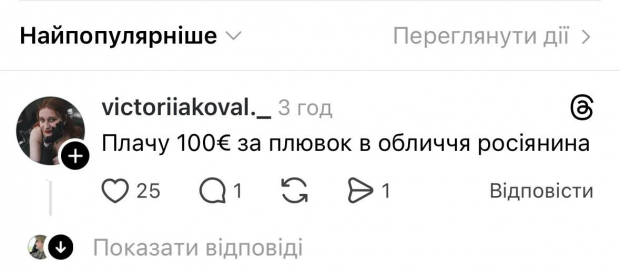 «Я заплатила 5€ в Берліні, щоб бармен плюнув в пиво росіянам прямо перед їх обличчями. Я досі вважаю це найкращою інвестицією у своєму житті», — йдеться в публікації.