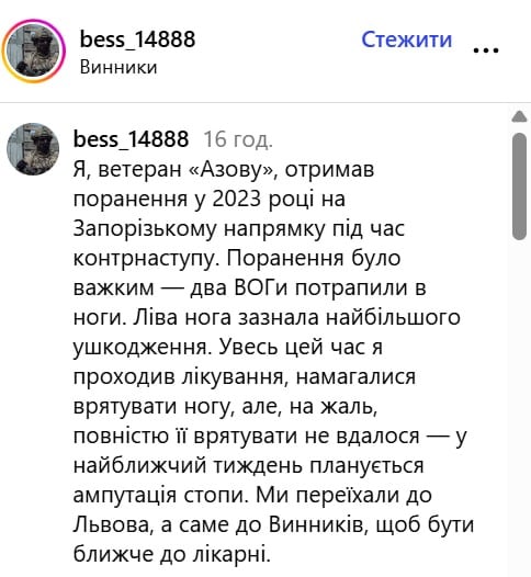 "Я, ветеран "Азову", отримав поранення у 2023 році на запорізькому напрямку під час контрнаступу. Поранення було важким – два ВОГ потрапили в ноги. Ліва нога зазнала найбільшого ушкодження. Увесь цей час я проходив лікування, намагалися врятувати ногу, але, на жаль, повністю її врятувати не вдалося – у найближчий тиждень планується ампутація стопи. Ми переїхали до Львова, а саме до Винників, щоб бути ближче до лікарні. Мене та мою дружину побили на порозі квартири через те, що я користуюся милицею та нібито "заважаю" сусідам", – розповів азовець у дописі.