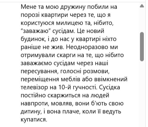 Каже, їм неодноразово надходили скарги на те, що вони нібито заважають сусідам "через пересування, голосні розмови, переміщення меблів або ввімкнений телевізор на 10-й гучності". За словами ветерана, сусідка скаржиться не лише на них, а й на інших мешканців будинку.