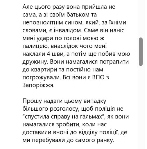 "Але цього разу вона прийшла не сама, а зі своїм батьком і неповнолітнім сином, який, за їхніми словами, є інвалідом. Саме він наніс мені удари по голові моєю ж палицею, унаслідок чого мені наклали чотири шви, а потім ще побив мою дружину. Вони намагалися потрапити до квартири й постійно нам погрожували. Усі вони є ВПО із Запоріжжя", – поінформував військовий і попросив про розголос. У дописі він оприлюднив відео візиту сусідів та його наслідки.