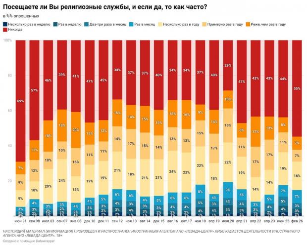 За даними соціологів, 55% росіян зізналися, що не ходять до церкви. Це найвищий показник за весь період президентства Володимира Путіна. Вперше з 1997 року частка тих, хто не відвідує богослужіння, перевищила частку вірян, які беруть участь у службах.