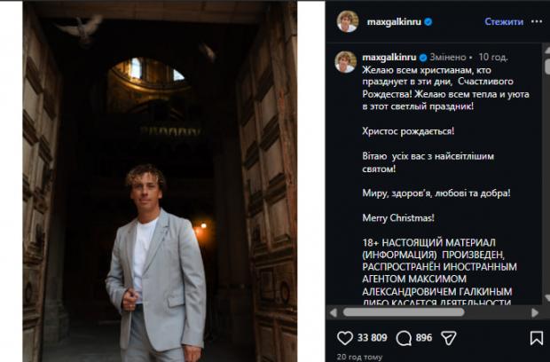 Російський артист та гуморист Максим Галкін привітав свою аудиторію в Instagram з Різдвом. Частина його привітання була написана українською мовою. На це у коментарях відреагували українці. Про це повідомляють Патріоти України із посиланням на допис артиста.