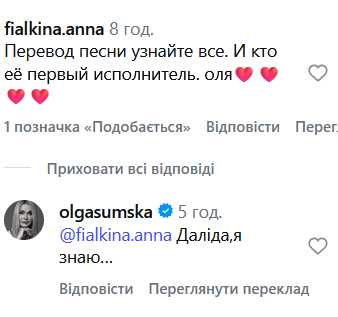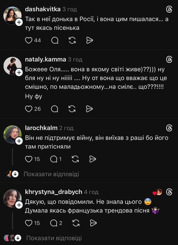 Зокрема в коментарях користувачі розділилися на два табори. Хтось заявляв, що Сергій Григор’єв-Апполонов не підтримує війну РФ, а інші розкритикували Сумську за відео з його піснею та пригадали їй про її доньку, яка живе та працює в Росії. На обговорення свого відео з піснею росіянина Ольга Сумська не відреагувала.