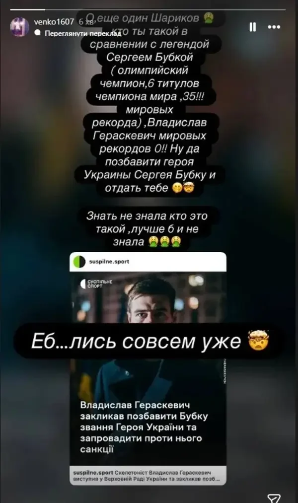 «О, ще один Шаріков. Хто ти такий у порівнянні з легендою — Сергієм Бубкою? Олімпійський чемпіон, 6 титулів чемпіона світу, 35!!! світових рекордів. Владислав Гераскевич — світових рекордів 0! Ну да, позбавити Героя України Сергія Бубку і віддати тобі. Знати не знала, хто це такий, і краще б не знала. Їб****ись зовсім уже», — написала Вікторія.