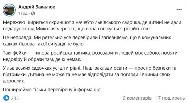 "Мережею шириться скриншот з начебто львівського садочка, де дитині не дали подарунок від Миколая через те, що вона спілкується російською. Це неправда. Ми ретельно усе перевірили і запевняємо, що в комунальних садках Львова такої ситуації не було", - написав у Facebook Андрій Закалюк, директор у Департамент освіти та культури Львівської міської ради.