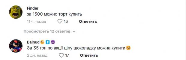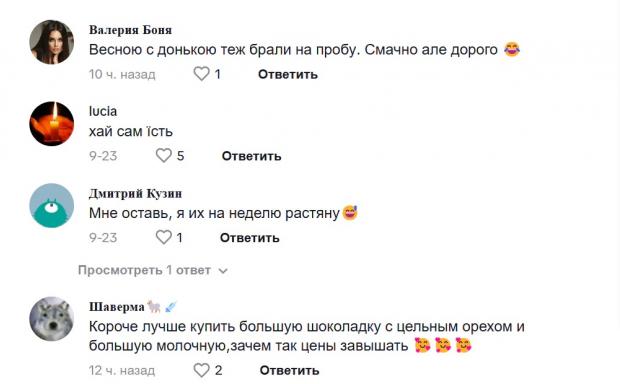 «За 1500 можна торт купити»; «Навесні з донькою теж брали на пробу. Смачно, але дорого»; «Якісний шоколад завжди дорогий»; «Це не просто шоколад, це гіандуя (джандуя) – суміш шоколаду з пастою з лісових горіхів, тому така ціна», – пишуть коментатори.