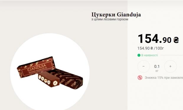 Ласощі Gianduja коштували 1549 гривень за кілограм. За три штучки дівчина заплатила 105 гривень. Це цукерки з молочного шоколаду з цільним лісовим горіхом.