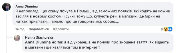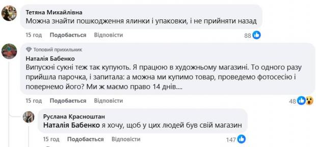 Користувачка Наталія Бабенко зазначила, що подібна практика існує і з одягом: «Випускні сукні теж так купують». Вона також поділилася досвідом роботи в художньому магазині, куди приходила «парочка, і запитала: а можна ми купимо товар, проведемо фотосесію і повернемо його? Ми ж маємо право 14 днів...».