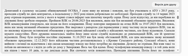 Обвинувачений — уродженець Запорізької області, ветеран АТО, який у 2022 році пішов на фронт добровольцем. У червні 2023 року він отримав бойове поранення, а за два тижні після цього переніс гострий інфаркт міокарда.