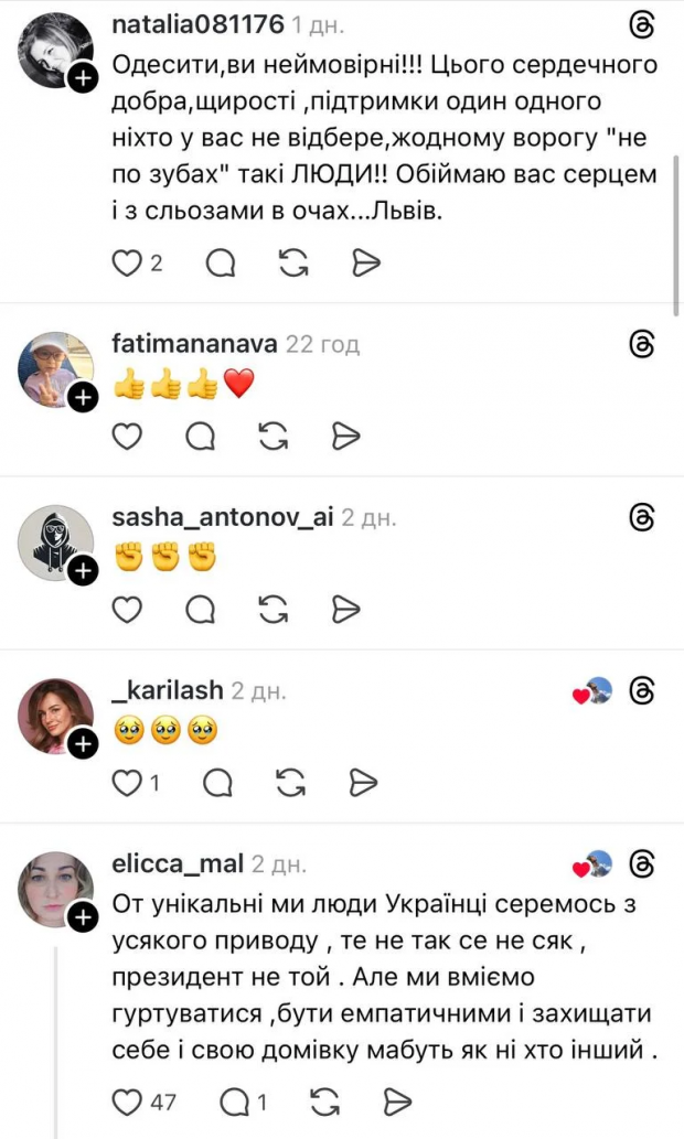«Одесити, ви неймовірні! Цього сердечного добра, щирості, підтримки один одного ніхто у вас не відбере, жодному ворогу „не по зубах“ такі люди! Обіймаю вас серцем і зі сльозами в очах», — прокоментувала публікацію львівʼянка Наталія.