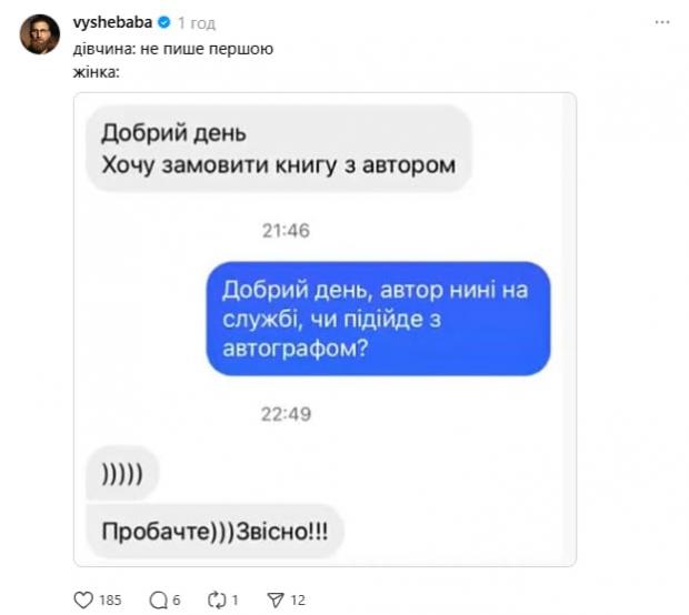 "Добрий день. Хочу замовити книгу з автором", – звернулася до Вишебаби співрозмовниця.