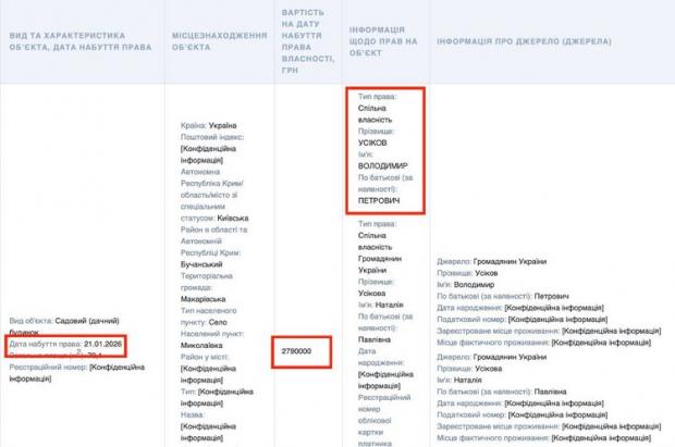 Згідно з оприлюдненими даними, напередодні Усіков також став власником ще одного об’єкта будівництва вартістю майже 3 млн грн.
