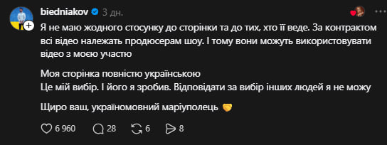 «Я не маю жодного стосунку до сторінки та до тих, хто її веде. За контрактом усі відео належать продюсерам шоу. І тому вони можуть використовувати відео з моєю участю. Моя сторінка повністю українською. Це мій вибір. І його я зробив. Відповідати за вибір інших людей я не можу. Щиро ваш, україномовний маріуполець», – написав ведучий.