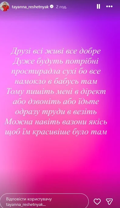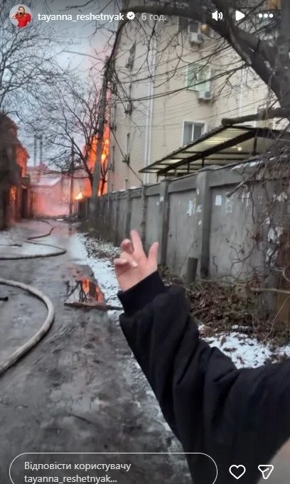 Співачка повідомила, що поблизу її будинку сталася сильна пожежа через приліт дрона. Вогонь перекинувся на будинок для літніх людей, і постраждалих довелося евакуювати. «У мене тут біля будинку просто приліт і біля будинку літніх людей. Зараз ми евакуюємо всіх дідусів, бабусь. І зараз дуже потрібен одяг, взуття, ковдри, все що є! Тому що людей 20. Будь ласочка. Малоземельна 14/1», — зазначила Тетяна Решетняк у Stories.