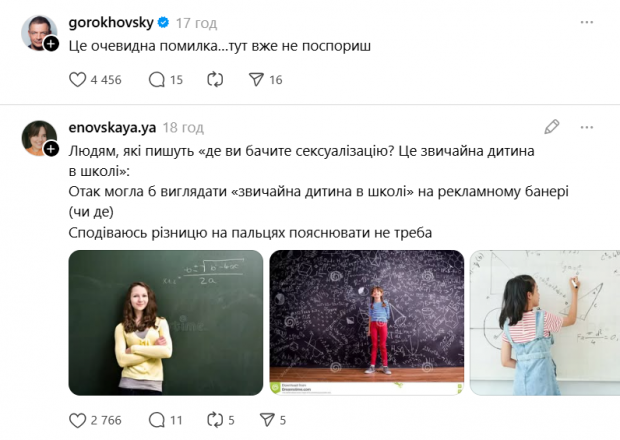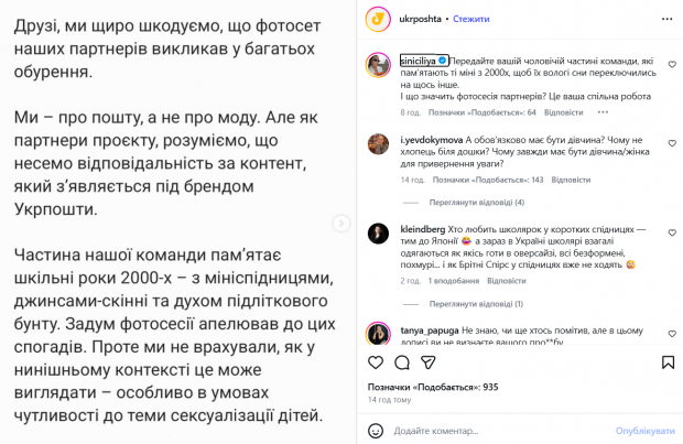 На фотографіях були зображені підлітки у відвертій шкільній формі, що викликало хвилю обурення серед користувачів. Зокрема, чимало коментаторів називає позування моделей і їхні образи недоречними і невідповідними для кампанії з державним оператором поштових послуг.