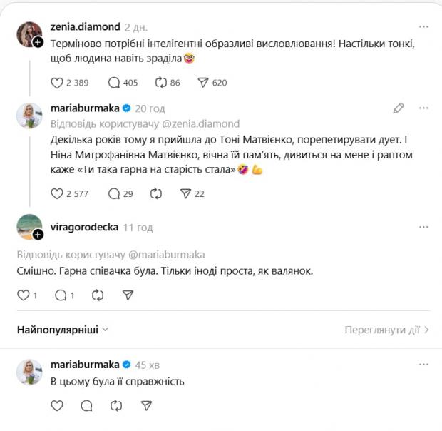 Українська співачка Марія Бурмака 2 березня в соцмережі Threads розповіла, як тонко й інтелігентно образила її колись українська співачка Ніна Матвієнко, передають Патріоти України.