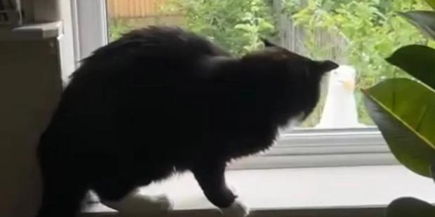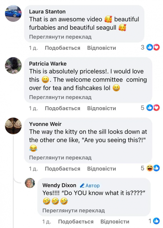 «Ми переїхали в Дорчестер у червні, і мої коти ніколи раніше не бачили чайок (вони кімнатні коти, тож суворо дивляться, не чіпайте котів) — це був перший раз, коли їм представився», — йдеться в публікації.