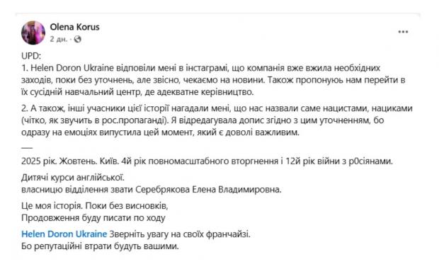 Згодом на своїй сторінці у соцмережі Facebook вона повідомила, що Helen Doron Ukraine відреагували на інцидент. "Helen Doron Ukraine відповіли мені в Instagram, що компанія вже вжила необхідних заходів, поки без уточнень, але, звісно, чекаємо на новини. Також пропонують нам перейти в їхній сусідній навчальний центр, де адекватне керівництво", – резюмувала Олена.
