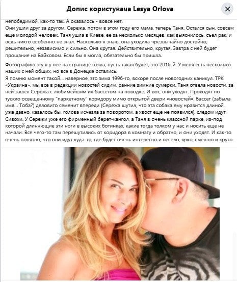 Вона згадала колегу як професійну, дотепну, сильну та яскраву особистість, яка до останнього мужньо боролася з недугою. «Сергій був дуже живий, і якось досі незрозуміло, що його насправді більше немає. І Таня була дуже жива — і тепер також незрозуміло. Вона здавалася невразливою, непереможною. А виявилося — зовсім ні. Вони пішли одне за одним. Сергій, потім його мама, тепер Таня. Залишився син, ще зовсім молодий. Таня пішла в Києві. Її за кілька місяців, як з’ясувалося, „з’їв“ рак, адже ніхто особливо не знав. Наскільки я знаю, вона йшла надзвичайно гідно, рішуче, незалежно та сильно. Вона крута», — написала Орлова.