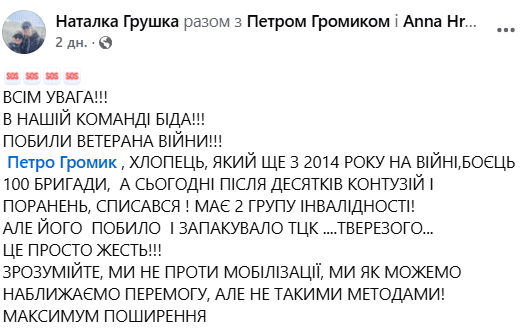 За її словами, ветеран Петро Громик ще з 2014 року перебувавав на війні. «Після десятків контузій і поранень списався. Має 2 групу інвалідності. Але його побило і запакувало ТЦК. Тверезого. Це просто жесть. Зрозумійте, ми не проти мобілізації, ми як можемо наближаємо перемогу, але не такими методами», — каже волонтерка