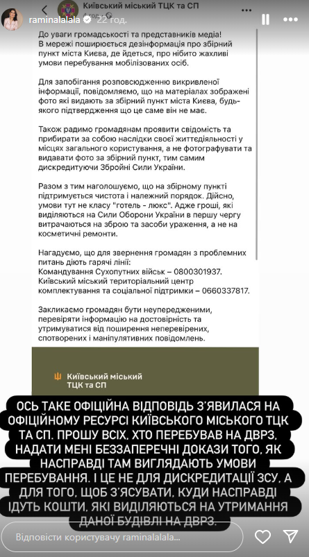 Після відповіді ТЦК блогерка звернулася до всіх, хто перебував на ДВРЗ, із проханням надати їй безпечні докази того, як насправді виглядають умови утримання. Вона заявила, що збирає матеріали для подальшого розслідування ситуації.